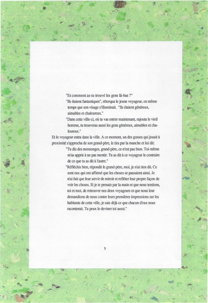 Et le voyageur, poursuivant son voyage, disparut dans les ruelles de la ville. Un peu plus tard, un autre voyageur engagea la conversation avec le vieil homme et finit par lui poser la même question: